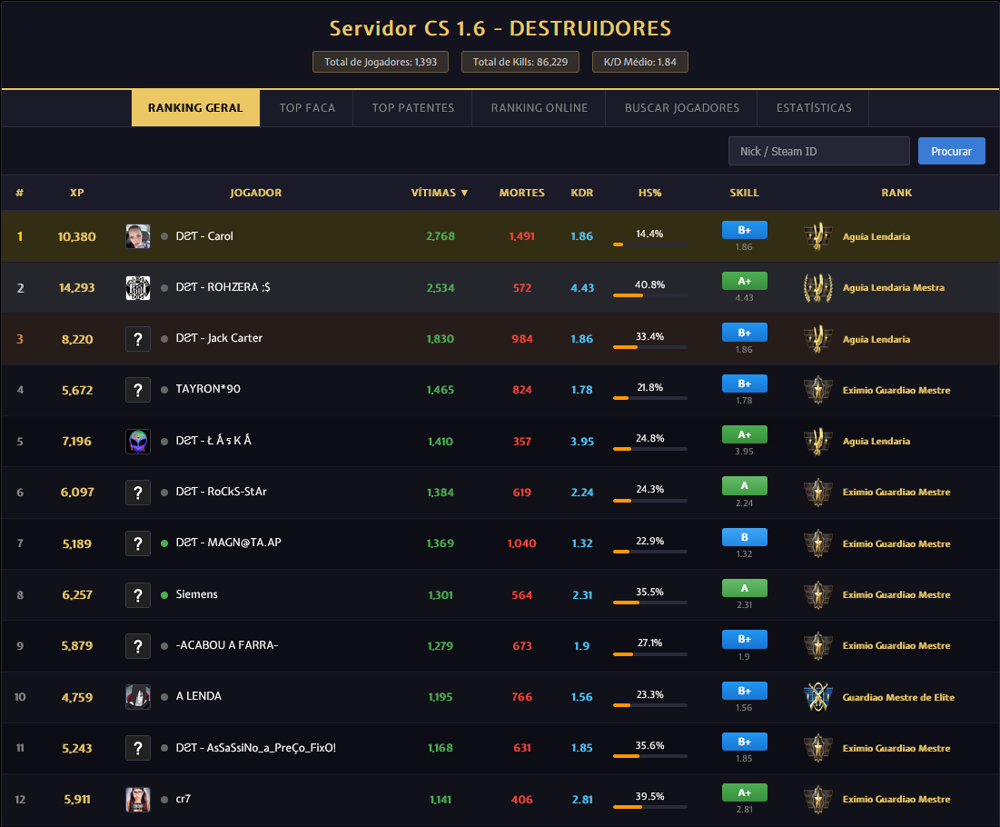 * /rank #nick - Ver as estatisticas do player correspondente ao nick escrito exemplo: /rank iceeedr (apenas parte do nick ja serve, mas nome completo evita falso positivo)