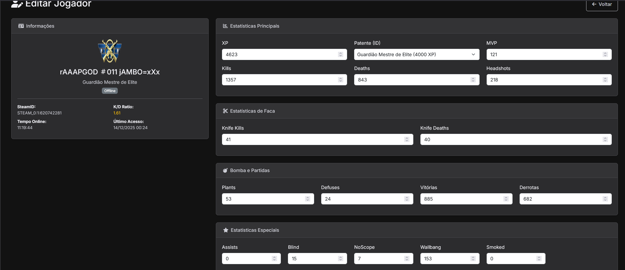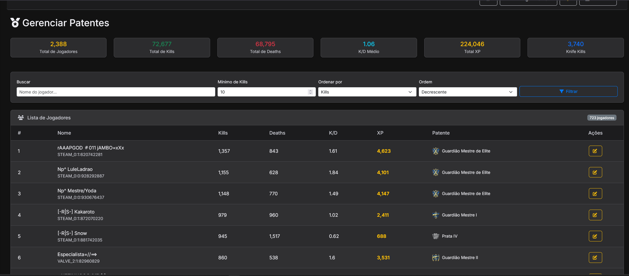 Gestão de Patente: Edite jogadores, veja o TOP e resete patentes pela web.