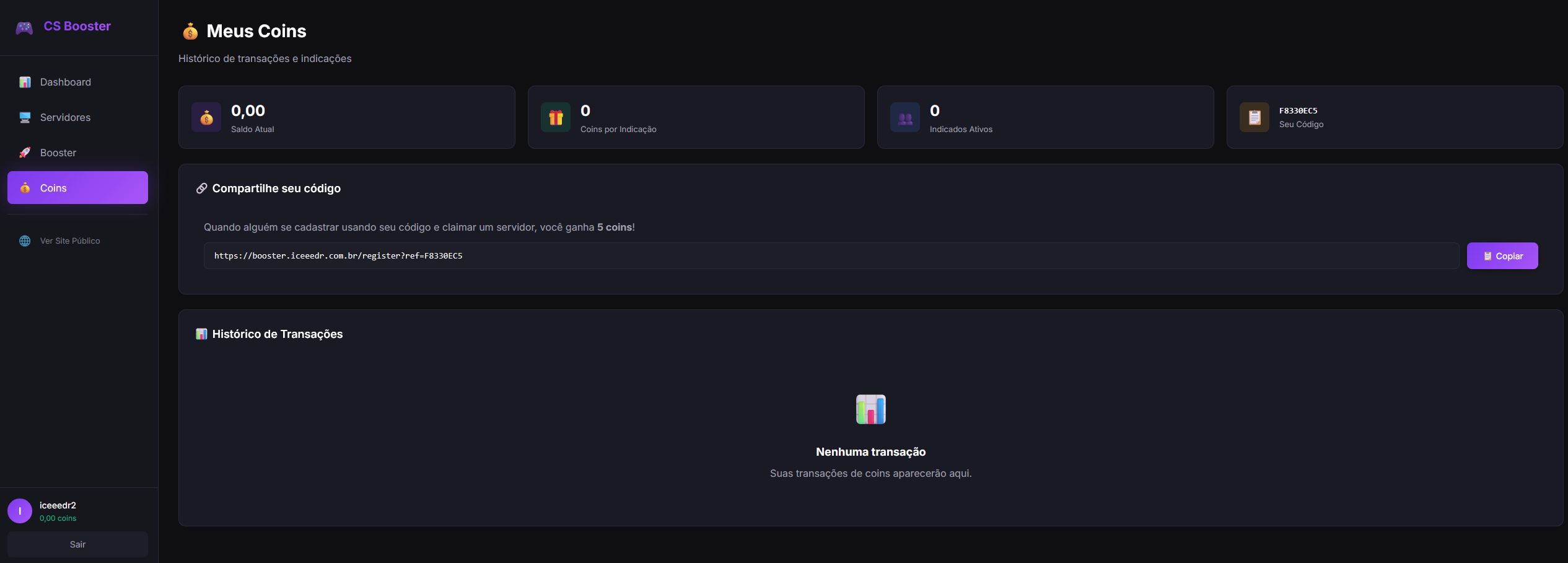 Quando ele se cadastrar com o seu link e claimar um servidor você ganha coins